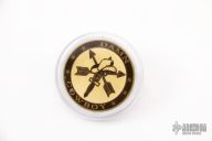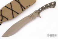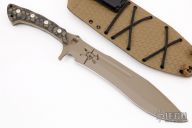 This Damn Cowboy by Kraken Tactical features a OD Green cerakote blade with notched thumbrest, .201" blade stock and 2.145" blade depth, full tang construction. The handle has laser engraved Nylon66 scales with brass liners. Comes with a kydex sheath and nylon carrying case. New from maker. Comes with COA #28 of 100.