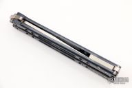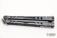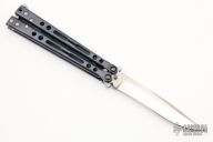 This Specter Balisong from Jerry Hom features a satin finish recurve balde with swedge. The handle is comprised of PVD and skeletonized titanium handles with satin titanium backspacers and T latch. Includes original box and paperwork. Excellent condition.