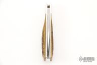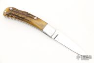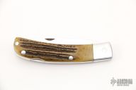 This lockback folder by WC Davis features a mirror finished blade with nail nick. The handle has an aluminum frame with dovetailed bolsters that are integral with the liners, stag scales, stainless steel lockbar.  Scuffs and scratches are visible on the blade/frame otherwise this knife would make a great user.
