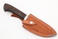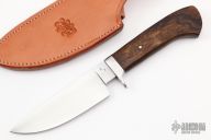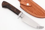This Hunter by Erik Fritz features a hand rub satin finished blade with visible temper line, .188" blade thickness and 1.398" blade depth, hidden tang construction. The handle has a stainless steel guard with ironwood grip. Very nice work. Comes with a hand tooled brown leather sheath. New from maker at the 2022 Blade Show West. Comes with a zippered case.