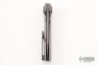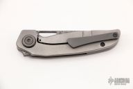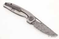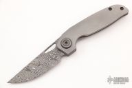 This Transient 2.9" flipper by Hellion Machine Collective features a Damascus blade with notched thumbrest, thumbhole and flipper. The handle has a bead blasted titanium frame with tip up zirconium clip, zirconium screws and pivot, zirconium backspacer, zirconium pivot collars. Nice detent, lockup and blade seating. Comes with cloth pouch. New from maker at the 2022 Blade Show West. Comes with COA.