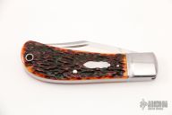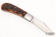 This Lanny's Clip by Bill Ruble features a satin finished clip point blade with a nail nick. The handle features fluted stainless steel bolsters, jigged bone covers with a stainless steel escutcheon over stainless steel liners and spring. Has half-stop, flush in all positions. Lanyard tube in pommel. Includes a zippered case. New from maker at the 2022 Blade Show West.