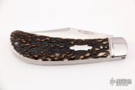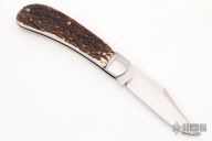 This Lanny's Clip by Mike Zscherny features a clip point blade with a hand rubbed satin finish and nail nick. The handle has a fluted stainless steel bolsters, stag covers, stainless steel liners and spring. Half stop on blade, flush in all positions. New from maker!