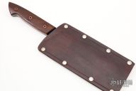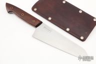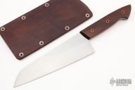 This Gyuto knife by Broco Knives features a hand rub satin finished Bohler K720 steel blade with .079" blade stock and 2.305" blade depth, full tang construction. The handle has Pau Ferro wood scales with copper pins. Coems with a leather slip sheath and COA. New from maker at the 2022 Blade Show West.