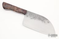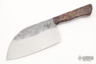 This Serbian Chef Knife by Baze Bladeworks features a hand rub satin finished 8670 blade with hammer marked flats, .130" blade stock and 3.025" blade depth, full tang construction. The handle has stabilized box elder burl wood scales. Comes with a zippered case. New from maker at the 2022 Blade Show West.