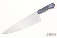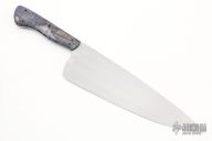 This Serbian Chef Knife by Baze Bladeworks features a hand rub satin finished 8670 blade with .099" blade stock and 2.483" blade depth, full tang construction. The handle has dyed and stabilized silver maple scales. Comes with a zippered case. New from maker at the 2022 Blade Show West.