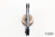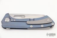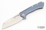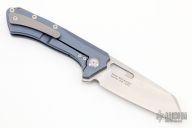 This Revenge from PMP Knives features a tumbled blade with a notched flipper tab. The handle features a blue anodized titanium frame with a matchig tip up pocket clip and backspacer.  Includes a padded zippered case. #316/350. Excellent Condition.