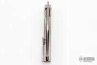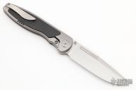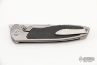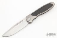 This Mini Tempest from Brian Nadeau features a hand rub satin finished drop point blade with a fuller and notched thumbrest/front flipper. The handle has a bead blasted titanium frame with carbon fiber inlays, satin titanium tip up clip. Nice detent, lockup and blade seating, stainless lockface insert. Includes original box. Excellent condition.