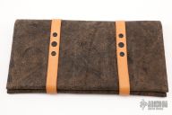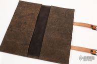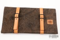 This 10-Knife Case by Robertson Leather Works is made from Cape Buffalo Leather. It has leather straps with buckles. The pockets are 5" by 2.125". New from maker at the 2022 Blade Show West.