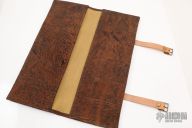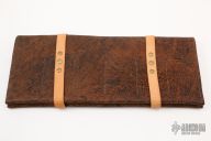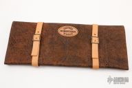 This 12-Knife Case by Robertson Leather Works is made from Cape Buffalo Leather. It has leather straps with buckles. The pockets are 5" by 2.25". New from maker at the 2022 Blade Show West.