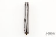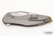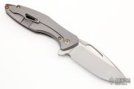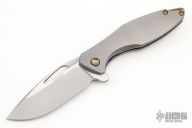 This Arius by Koenig knives features a bead blast finish blade with satin flats, thumbhole and flipper. The handle has a bead blasted titanium frame with a titanium tip up clip, anodized titanium backspacer. Has ceramic bearings and a ceramic detent ball. Nice detent, lockup and blade seating. Comes with original box and COA. Gen4B4. Excellent condition.
