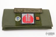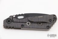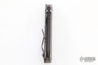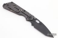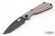 The SnG is Strider Knives most popular folder. Great size for every day carry, but big and strong enough when you need a serious knife. Titanium frame lock means this knife is strong enough to handle anything you can throw at it. On this Diamond Grip profile, the G-10 side's edges are sightly radiused and have a diamond pattern texture. This "hybrid" variation has the Diamond Grip profile on the G10 side and a "standard" titanium side. This gives both the great grip and lower profile of the Diamond Grip and the little extra real estate for your hand on the lock side. Custom oversized stainless steel bull pivot G10 is one piece with integrated backspacer for extreme rigidity Hinderer lockbar stabilizer to insure linear movement of lock bar and prevent over springing Stout and secure titanium pocket clip Oval hole opener. Stud on blade is not intended to be used as opener but rather to contact titanium frame in open position as blade stop The Blade: Sleek, dagger type profile with large upper swedge grind from super tough 3V. The blade has been given a matte black oxide finish. The Frame: Diamond Grip profile with full width radiused and textured G10 side and Standard profile titanium scale with flamed finish. Comes with a Velcro pouch with patches. Has a few light scuffs, otherwise excellent condition.