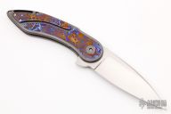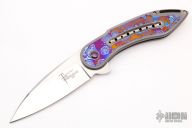 This One of a Kind Glimpse linerlock flipper by Todd Begg features a hand rub satin finished blade with flipper. The handle has a two tone titanium frame with Mokuti inlays, lanyard hole and tip up mokuti clip. Nice detent, lockup and blade seating. Excellent condition. Comes with a zippered case.