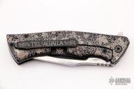 This is an impressive collaborative knife design from Zieba Knives and Jason Knight. Its rounded titanium frame lock handle is contoured for comfortable use, and has a laser engraved finish. The knife sports a unique harpoon style recurve Damasteel blade with stylized grooves and a flipper tab. The knife comes complete with a machined titanium pocket clip for secure tip-up carry. Titanium handle construction provides a durable, lightweight frame. Steel lock bar insert for secure over-travel protection. Ceramic ball-bearing pivot makes blade deployment a snap. This knife has milled pockets on the inside that have inlays of cast bronze skulls. Comes with zippered. New from maker.