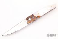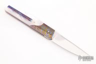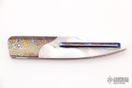 This is the latest version of the CITY by Jean-Pierre Martin.  It features a hand rub satin finished blade with flipper and notched thumbrest. The handle has Mokuti bolsters, beautiful mother of pearl scales, stainless steel liners, gold plated screws, Mokuti tip up clip with hidden screws. One thing that is pretty neat is the way the button lock mechanism works. When the knife is open, you push the button to close it obviously, but inside the knife, under the button, is a liner that engages the blade. The part that is mind blowing, is that when you press the button, the liner raises up and out of the way. I still don't fully understand how it works, but its cool! Comes with a leather pouch and COA. New from maker.