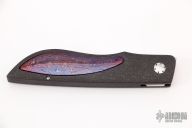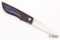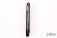 This Gentleman's Folder by Jean-Pierre Martin features a hand rub satin finished blade with a notched thumbrest and front flipper. The handle has a carbon fiber frame with blued Damascus inlays, stainless steel liner, carbon fiber backspacer. The pocket clip is really the party piece to this knife and it is genius. The clip is the inlay on the presentation side of the knife. Pressing on the butt of the pocket clip will raise up the end of it, then once you slide it into your pocket, the back of the clip raises up as well. When it is not in use, it slips back down flush into the handle. Comes with a leather pouch and COA. New from maker.