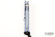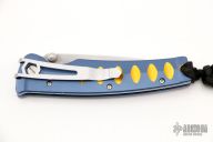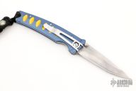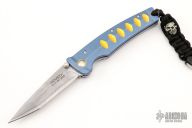 This Katana Manual by MCUSTA features a VG-10 San Mai tanto style blade with dual thumb stud. The handle has a blue anodized aluminum scales with yellow anodized notches over a single steel liner. Lanyard hole in pommel. The steel deep carry pocket clip is positioned for tip down, right hand carry.  Includes original box. Some scuffs on blade and carry marks on handle otherwise the knife is in good condition.