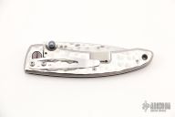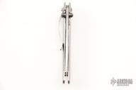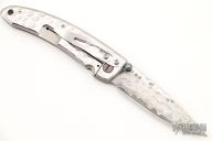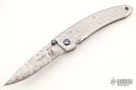 This frame lock features a Damascus blade with scalped flats and dual thumbstuds.  The handle features a scalped stainless steel frame with a matching tip down pocket clip.  Includes the original box.  Light scratches are visible on the blade otherwise the knife is in Excellent Condition.