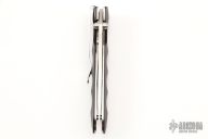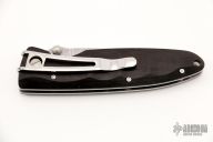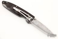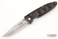 This linerlock folder by Mcusta features a Damascus blade marked "MCUSTA, SEKI JAPAN". The handle features ebony wood scales over stainless liners with a matching tip down pocket clip. Includes the original box. Excellent Condition.