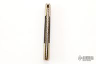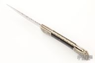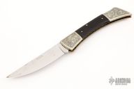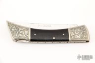 This Lockback by David Dill has a mirror polished blade with fileworked spine and nail nick. The handle has engraved nickel silver bolsters, black wood scales, fileworked brass liners, fileworked stainless steel backspacer. Nice lockup and blade seating. Has some patina on the blade and handle, otherwise good condition.