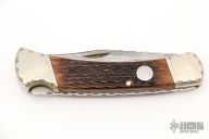 "This old classic BUCK knife 110 "Folding Hunter" was first introduced in 1965 - it has been BUCKS mainstay ever since. Some say the Buck 110 is the most copied knife in the world. This Buck automatic knife has a Damascus blade, jigged bone handle with a nickel silver frame and a button that opens knife automatically. This one has filework on the frame and blade spine. Has some patina, otherwise good condition.