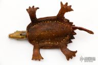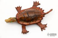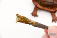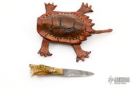 This knife by D.R. Good features a Damascus drop point blade with a partial full tang construction.  .10" Blade Stock.  .420" Blade Depth.  The handle features a carved bone handle.  Includes a brown leather sheath in the shape of a turtle. Excellent Condition.