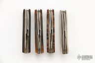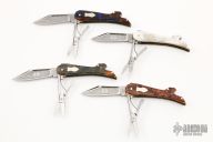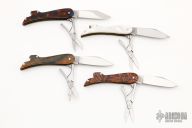 These four knives by Bull Dog Brand Knives have mirror polished blades, scissors, various vintage acrylic style handles, nickel silver escutcheons, brass liners and steel springs. They have a few light scratches, but overall excellent condition for their age!