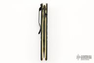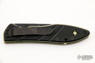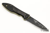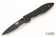 This 880 Darkstar is an Allen Elishewitz design executed by Benchmade. It features a black partially serrated blade with false top edge and dual thumbstuds. The handle has black G-10 scales over anodized titanium liners and tip down stainless steel clip. Nice detent, blade seating and lock up. Excellent condition.