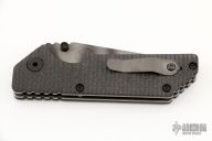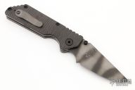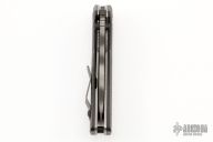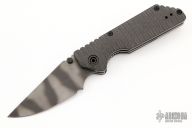 This AR folder by Strider features a tiger striped clip point blade with dual thumbstuds and a notched thumbrest. The handle has ribbed carbon fibers scales, tumbled titanium liners and black stainless clip. Notches on thumbrest, lockup and rear of handle. Marked 013 on the blade. Has a couple scuffs, otherwise excellent condition.