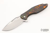 This Arius Flipper by Koenig knives features a two-tone blade with thumbhole. The handle has a Shepards 80s camo fat carbon and bead blasted titanium frame, tip up clip with hidden screws and anodized titanium backspacer. Has ceramic bearings and a ceramic detent ball. Nice detent, lockup and blade seating. Comes with original box and COA dated September 5, 2022. Includes the original titanium scale.  Excellent condition.
