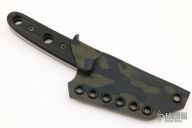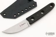 This Kwaiken by Randy Doucette features a bead blasted blade with a notched thumbrest, .132" blade stock and .931" blade depth, full tang construction. The handle has black canvas micarta scales with black screws. Comes with a kydex sheath. Has some sheath marks otherwise excellent condition.