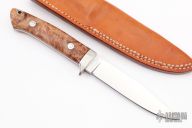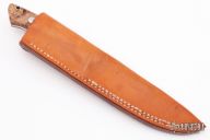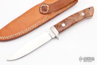 This Hunter by JB Moore features a mirror polished clip point blade with .170" blade stock and .925" blade depth, full tang construction. The handle has a nickel silver guard, burl scales with red liners/spacers, nickel silver pins and lanyard hole. Comes with a brown leather sheath. #1392on blade. Spotting is visible on the blade and guard otherwise the knife is in excellent condition.