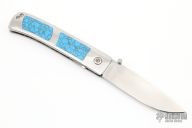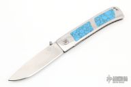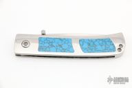 This knife by CH Morris features a hand rub satin finished drop point blade with dual thumstuds. The handle has a mirror polished stainless steel frame with turquoise inlays,  jeweled stainless steel liners. Comes with padded zippered case. Nice lockup and blade seating.  Knife is marked C-3. Excellent Condition.