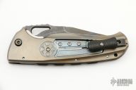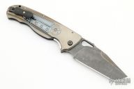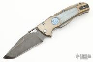 This D/A Auto from Matt Diskin features an acid tumble finished tanto blade with thumbhole and checkered thumbrest. The handle has a two-tone anodized and milled titanium frame, tip up reversible titanium/carbon fiber clip, and a jimped carbon fiber backspacer, stainless steel liner. The wheel on the front scale is the release for the blade, spin it clockwise to fire. Has anodized titanium hardware. This takes a few tries to master, but once you figure it out it is a very interesting design. Nice detent, lockup, action and blade seating. Excellent condition. Comes with a zippered case.