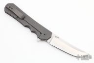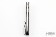 This Framelock Flipper by Jason Clark features a satin finished blade with a notched flipper. The handle has a dovetailed titanium bolster, carbon fiber scale, anodized and tumbled titanium liner and lockside with matching tip up clip, a carbon fiber backspacer. Rides on IKBS, nice detent, lockup and blade seating. Has a couple light scratches, otherwise excellent condition.