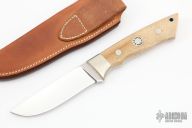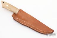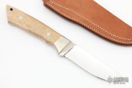 This knife by Corbit Sigman features a satin finished drop point blade with a tapered tang construction.  .173" Blade Stock.  1.040" Blade Depth.  The handle features nickel silver bolsters with bone scales.  Includes a brown leather sheath.  There is some pride between the scales and the tang otherwise the knife is in Excellent Condition.