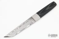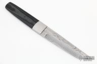 This Aikuchi by Bud Nealy features a Meier Steel Damascus tanto style blade with 0.124" blade stock and 1.025" blade depth, full tapered tang construction. The handle is comprised of satin finish titanium dovetailed bolsters and g10 scales. #3209. Has some light scuffs and scratches, great condition.
