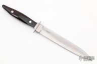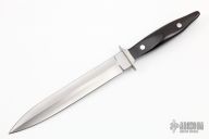 This dagger features a fine bead blasted blade with a tapered tang construction. .191" Blade Stock. 1" Blade Depth. The handle features a steel guard with cocobolo wood scales. Excellent Condition.