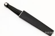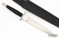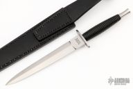 This Dagger features a satin finished blade with a dagger style blade. .170" Blade Stock. 1.021" Blade Depth. The handle features a steel guard and butt with an ebony wood grip. Includes a black leather sheath. Excellent Condition.