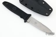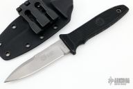 This M-10 by Gryphon Knives is a Bob Terzuola design, it has a bead blasted spear point blade with false top edge and notched thumbrest, .196" blade stock and .919" blade depth, hidden tang construction. The handle has a black FRN grip with lanyard hole. Comes with kydex sheath with small TekLok. Has some light scuffs, otherwise excellent condition.