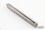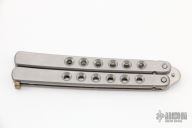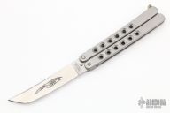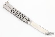 This Balisong by Parker Cutlery Company features a satin finished blade. The handles are polished stainless steel with a nickel silver t-latch. Includes the original box.  Light scratches are visible on the blade/handle otherwise the knife is in Excellent Condition.