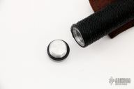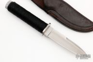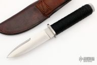 This Survival Boot Dagger by Dan Thornton features a satin finished spear point blade with false top edge, hidden/hollow tang construction, .168" blade stock and .968" blade depth. The handle has a stainless steel guard, cord wrapped hollow aluminum handle and a removeable aluminum butt cap. Butt cap is stamped "176" Comes with a brown leather sheath (not original). Excellent condition.