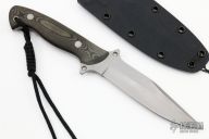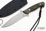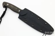 This Fighter by Keith Murr features a bead blast finished blade and a black linen micarta scales with .179" blade stock and 1.230" blade depth, full tang construction. Comes with a kydex neck sheath, but a TekLok or some other kind of belt loop could be added. Has some scuffs from the sheath, otherwise excellent condition.