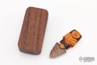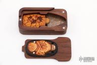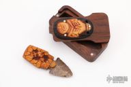 Bronze Lepenski Vir Elfshot Dagger is hand forged, carved and hand pyrographed by Tom Sterling. The bronze through-tang blade is 1" long. The tiny boxwood handle scales are hand pyrographed by Tom. Hand engraved and carved with god (goddess?) from the Lepenski Vir Middle Stone Age archaeological site in Serbia, and hand carved skull cache with fossil ivory inlaid dead eye on the reverse. Magnetic lid black walnut case include. New from maker!