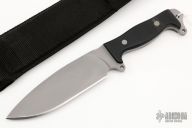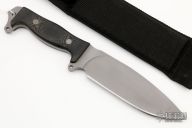 This Steel Heart by Busse Combat Knife Co. features a bead blast finished blade, .250" blade thickness and 1.868" blade depth. The handle has black linen micarta scales, full tang construction. This knife comes with a nylon and kydex sheath. Has old "Busse Combat Knife Co. Wauseon, Ohio USA" logo on a-side of blade. Has a few light scuffs, otherwise excellent condition. Rare old Busse. Less than 200 made with ATS-34.