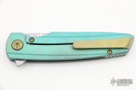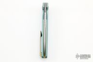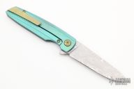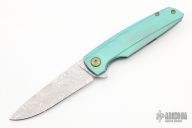 This Specter by Holt Bladeworks features a Damasteel blade with a notched thumbrest and flipper tab.  The handle features a milled titanium frame with anodize finish tip down pocket clip and hardware. Nice detent, lock up and blade seating. Includes the original box and papers. Light scuffs are visible on the pocket clip otherwise the knife is in excellent condition.