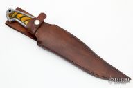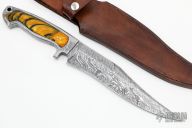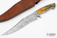 This Knife by SMID Damascus features a Damascus blade with false top edge, .220" blade stock and 1.869" blade depth, integral handle with pearlex inlays. Comes with a brown leather sheath. New from maker.