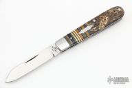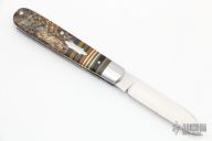 This Slipjoint by TA Davison features a hand rub satin finished drop point blade with nail nick. The handle has stainless steel bolsters, stabilized hemp covers, micarta spacers with stainless steel escutcheon, coin edged stainless steel liners, stainless steel spring. . Has half-stop, flush in all positions. Includes a padded zippered case.  #2275.  New from maker!
