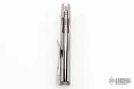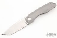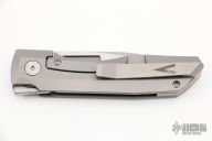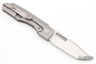 This Impulse Mini by Vero Engineering features a stone wash finished blade with notched thumbrest and flipper. The handle has a tumbled titanium frame with satin titanium hardware, matching tip up clip with hidden screws and backspacer. Nice detent, lockup and blade seating. Comes with a zippered case.  S/N 353.  Excellent Condition.