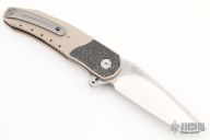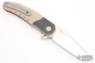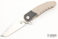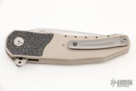 This A2 A3 Flipper flipper from Andre Thorburn and Andre Van Heerden features a hand rubbed satin finish tanto style blade with a false top edge, notched thumbrest and flipper. The handle has 3D CNC formed tan G-10 scales with silver lightning strike carbon fiber inlaid bolsters, tan G-10 backspacer, anodized titanium liners, and a 3D titanium clip with ceramic ball, tip up carry. Features DUAL ROW IKBS. Excellent fit and finish. Smooth action. Comes with a zippered case. Has a few light scuffs and scratches, otherwise excellent condition.